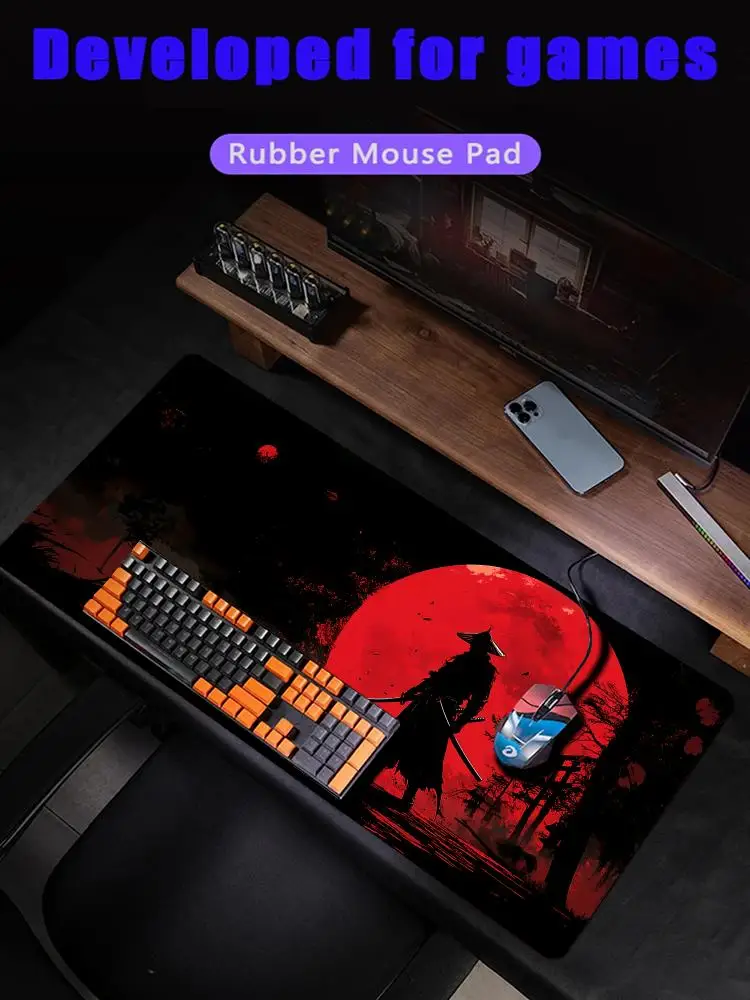 Red full moon samurai design Mouse Pad Desk Mat with Stitched Edges non-Slip rubber base pc accessories Gaming mat maus pad