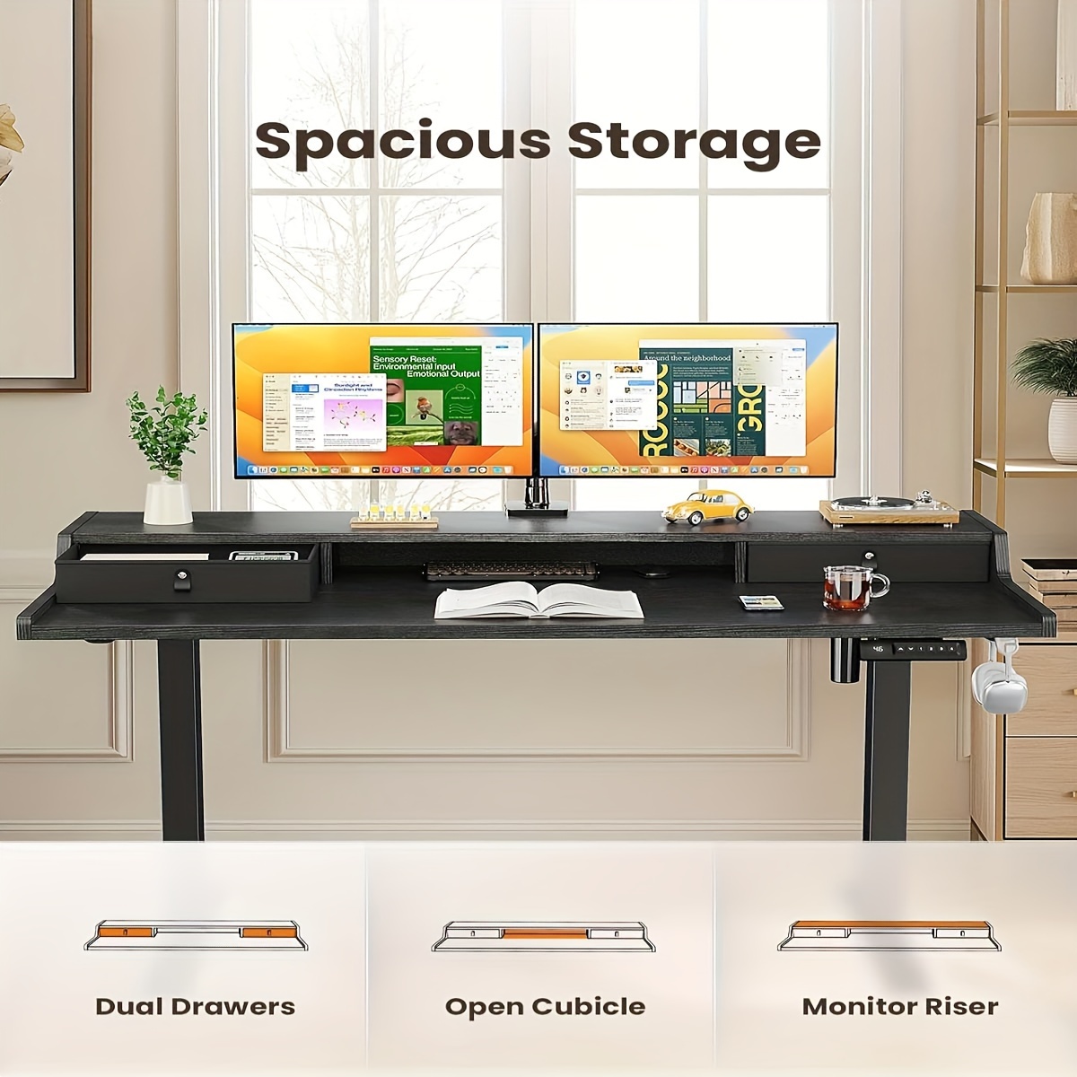 Triple Storage: Features a 23.7" desktop with two drawers and an open cubicle for accessories. The integrated monitor riser adds a personal touch to your workspace.